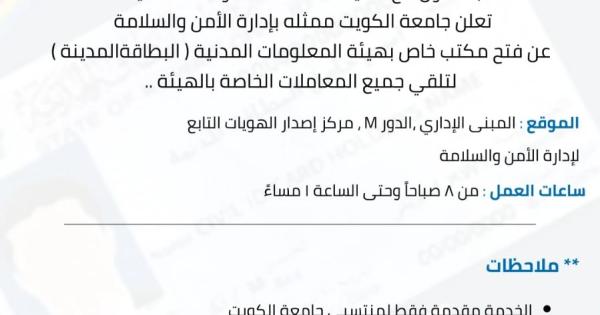 بالتعاون مع الهيئة العامة للمعلومات المدنيه تعلن جامعة الكويت ممثله بإدارة الأمن والسلامة عن فتح مكتب خاص بهيئة المعلومات المدنية ( البطاقةالمدينة ) لتلقي جميع المعاملات الخاصة..