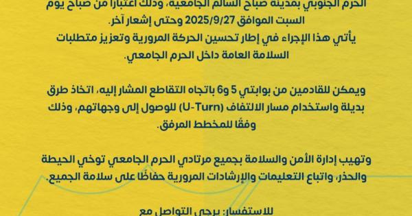 إدارة الأمن والسلامة تعلن عن إغلاق جزئي للتقاطع المقابل لمركز الإطفاء في الحرم الجنوبي بمدينة صباح السالم الجامعية تنبيه هام تعلن إدارة الأمن والسلامة، بالتعاون والتنسيق مع قطاع..