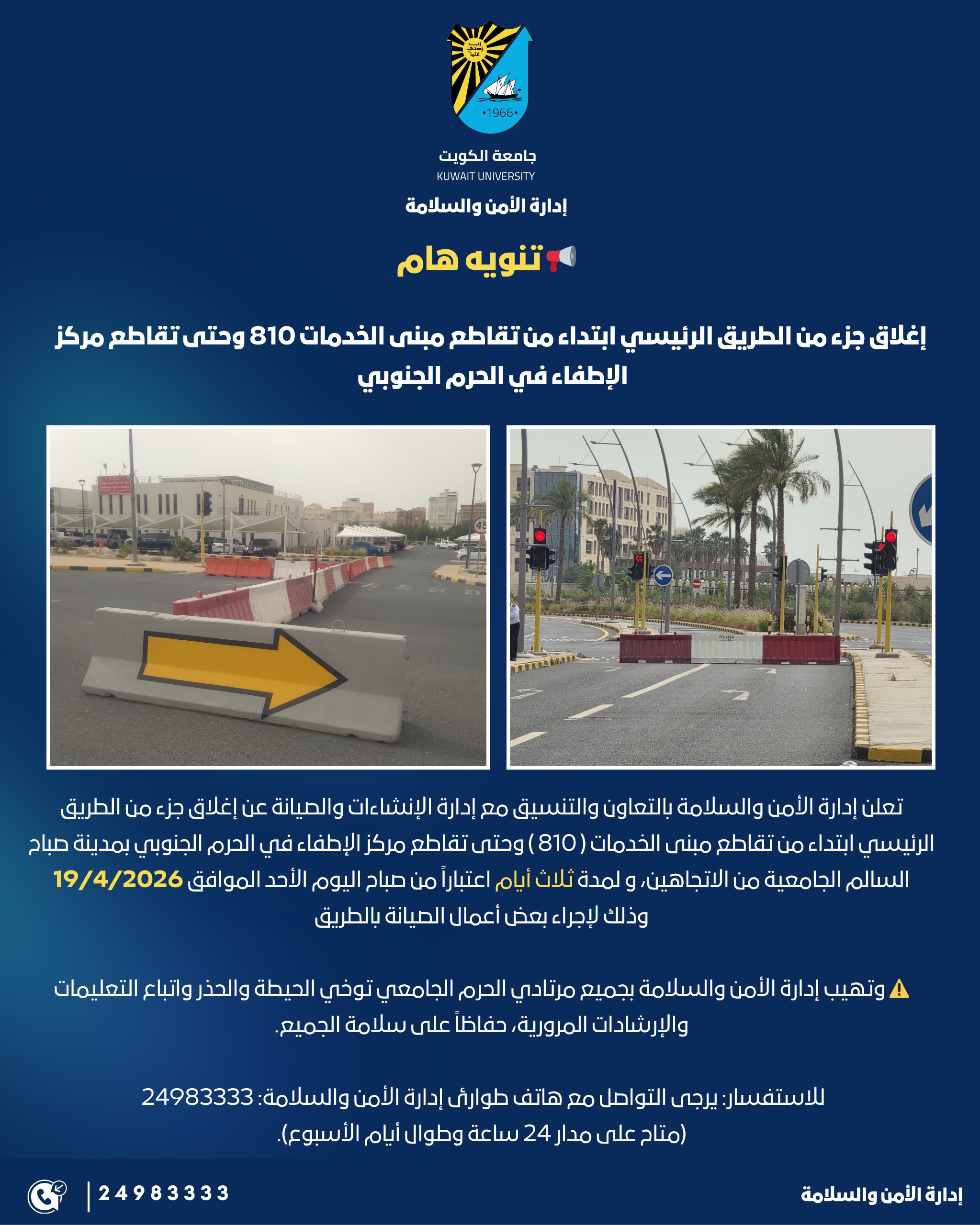 تعلن إدارة الأمن والسلامة بالتعاون والتنسيق مع إدارة الإنشاءات والصيانة عن إغلاق جزء من الطريق الرئيسي ابتداء من تقاطع مبنى الخدمات ( 810 ) وحتى تقاطع مركز الإطفاء في الحرم الجنوبي بمدينة صباح السالم الجامعية من الاتجاهين، و لمدة ثلاث أيام اعتباراً من صباح اليوم الأحد الموافق 19/4/2026 وذلك لإجراء بعض أعمال الصيانة بالطريق