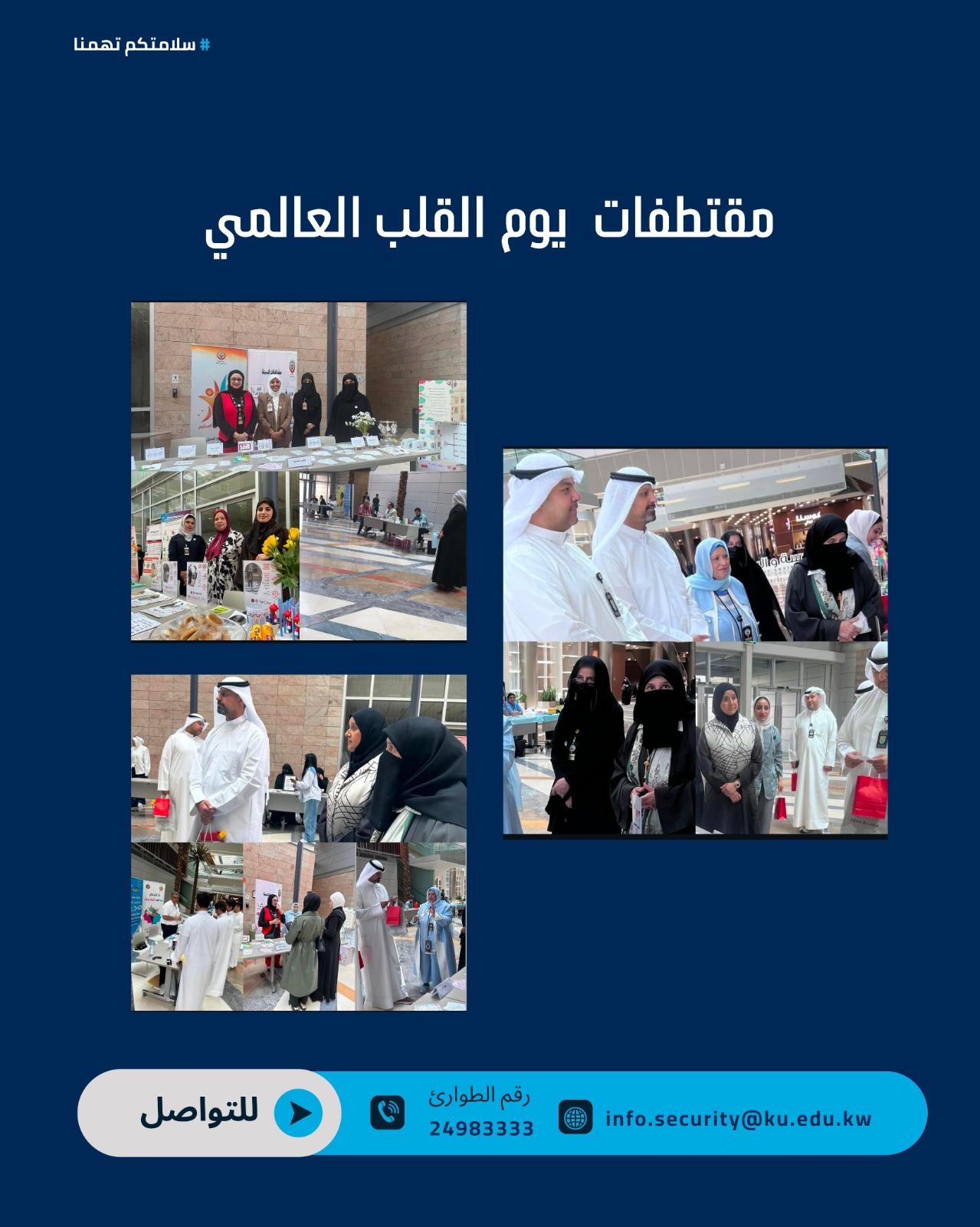 في ضوء التنسيق المتواصل بين جامعة الكويت مُمثلةً في (إدارة الأمن والسلامة) ووزارة الصحة وفق البروتوكول المُتفق عليه بشأن فتح قناة اتصال لتعزيز مبدأ الشراكة المجتمعية في جميع المجالات التي من شأنها المساهمة في نشر الوعي الصحي بين شرائح المجتمع الجامعي والحفاظ على السلامة العامة لأبنائنا وبناتنا الطلبة والطالبات وجميع منتسبي ومرتادي الجامعة وتوعية المجتمع بعوامل الاختطار ونشر مفهوم الوقاية خير من العلاج، والكشف المبكر للمرض لسهولة التحكم والتشافي منه.