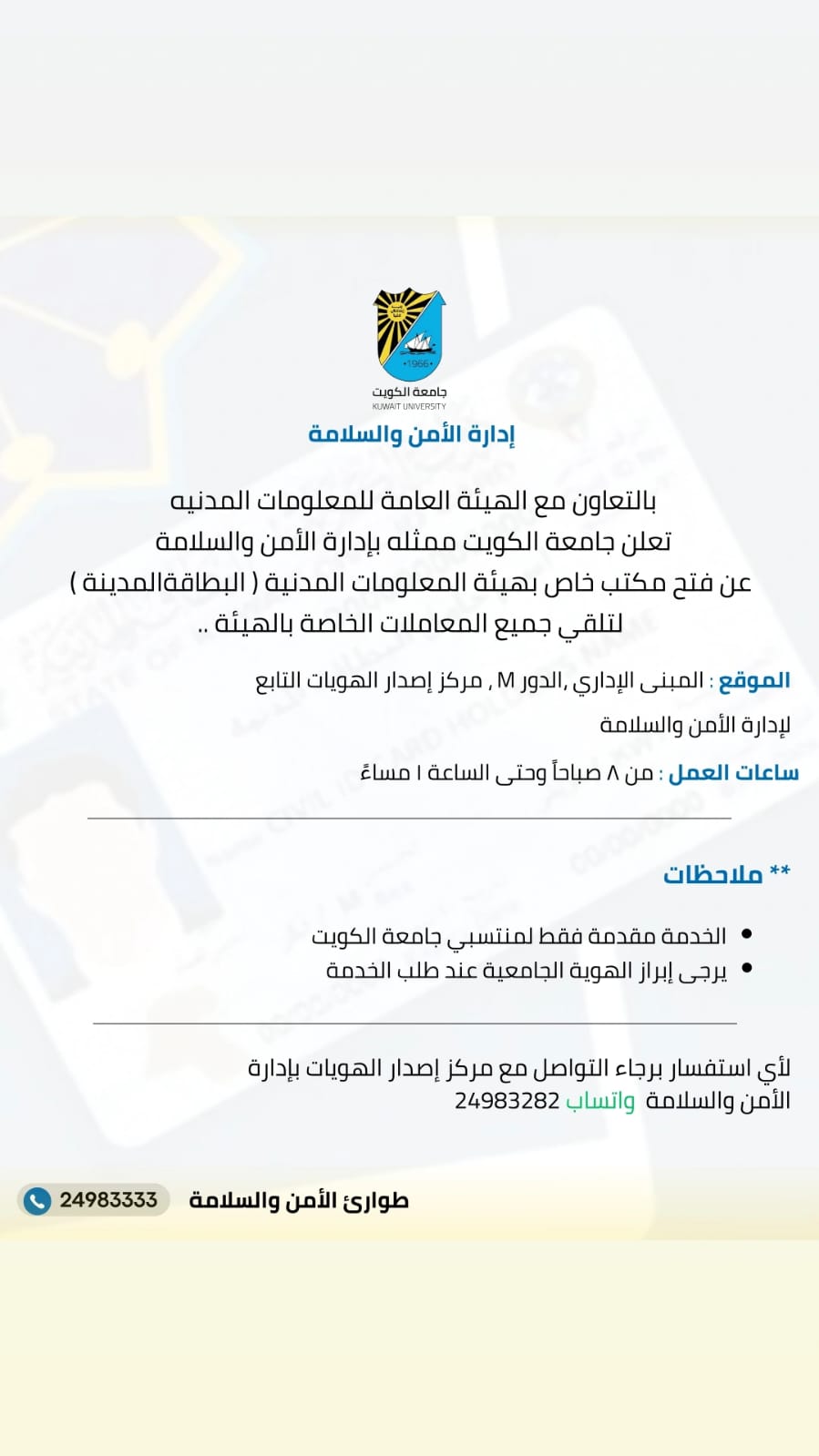 بالتعاون مع الهيئة العامة للمعلومات المدنيه تعلن جامعة الكويت ممثله بإدارة الأمن والسلامة عن فتح مكتب خاص بهيئة المعلومات المدنية ( البطاقةالمدينة ) لتلقي جميع المعاملات الخاصة بالهيئة ...