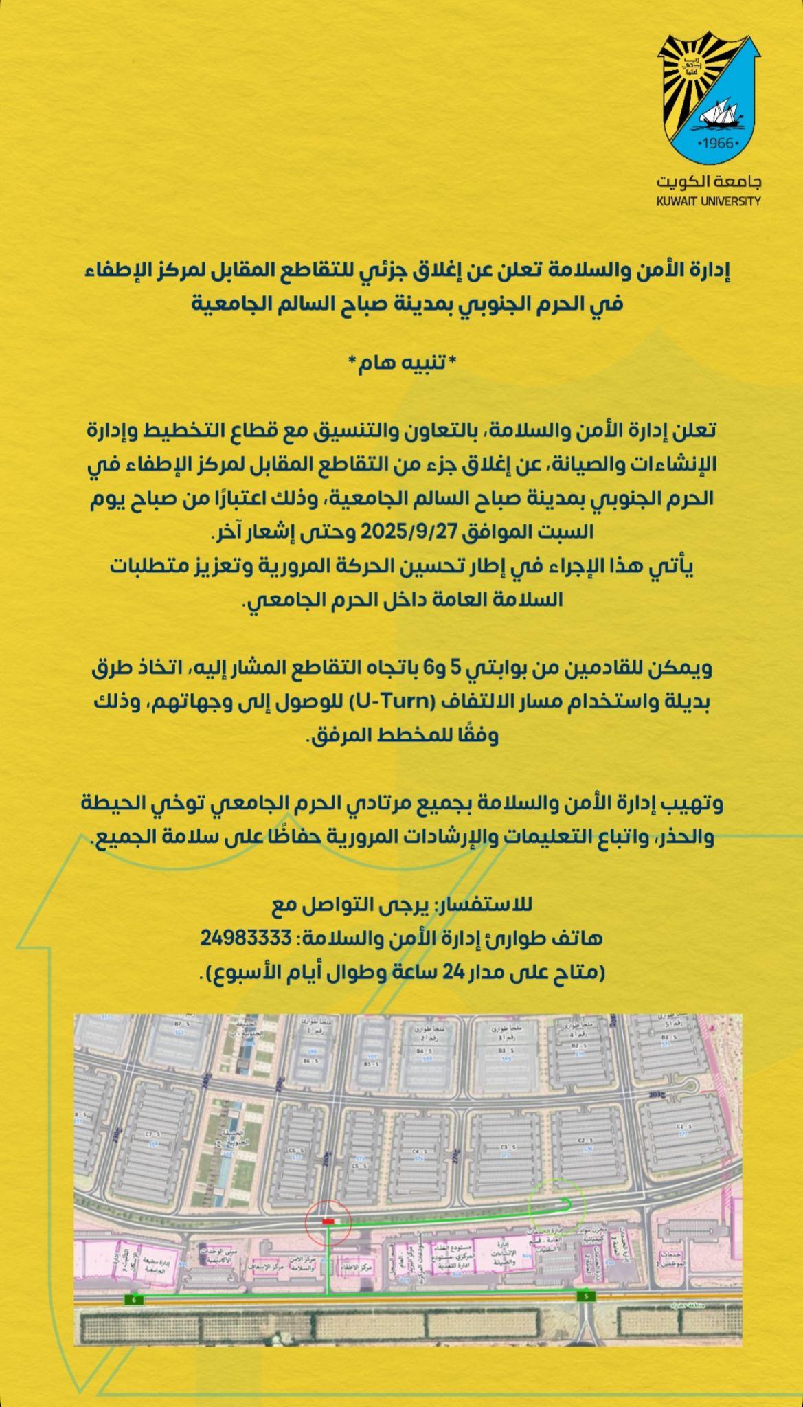 تعلن إدارة الأمن والسلامة، بالتعاون والتنسيق مع قطاع التخطيط وإدارة الإنشاءات والصيانة، عن إغلاق جزئي من التقاطع المقابل لمركز الإطفاء في الحرم الجنوبي بمدينة صباح السالم الجامعية، وذلك اعتباراً من صباح يوم السبت الموافق 27/9/2025 وحتى إشعار آخر.